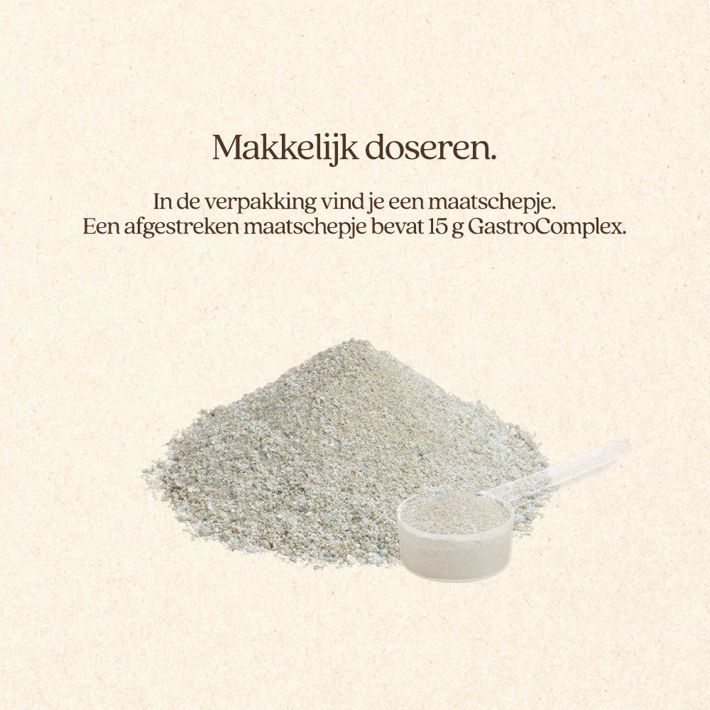 GastroComplex is een natuurlijk, graan-, gluten-, soja- en GMO-vrij recept met toegevoegde mineralen. Het bevat geen toegevoegde suikers.